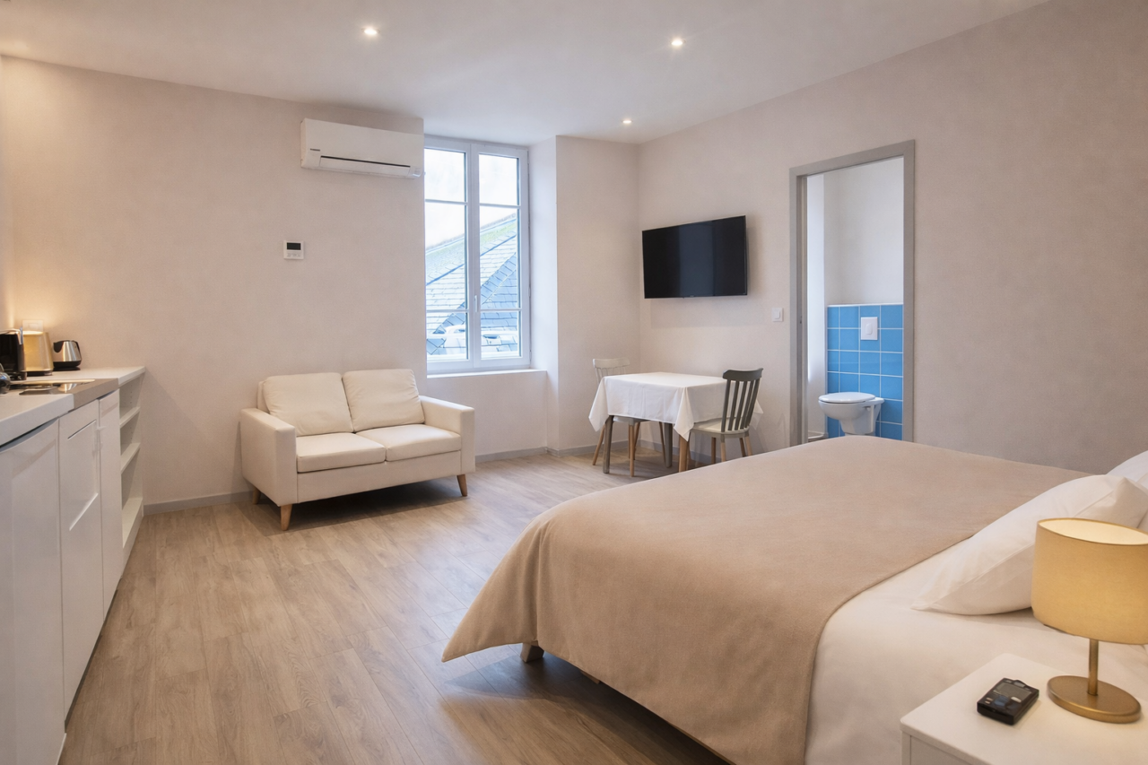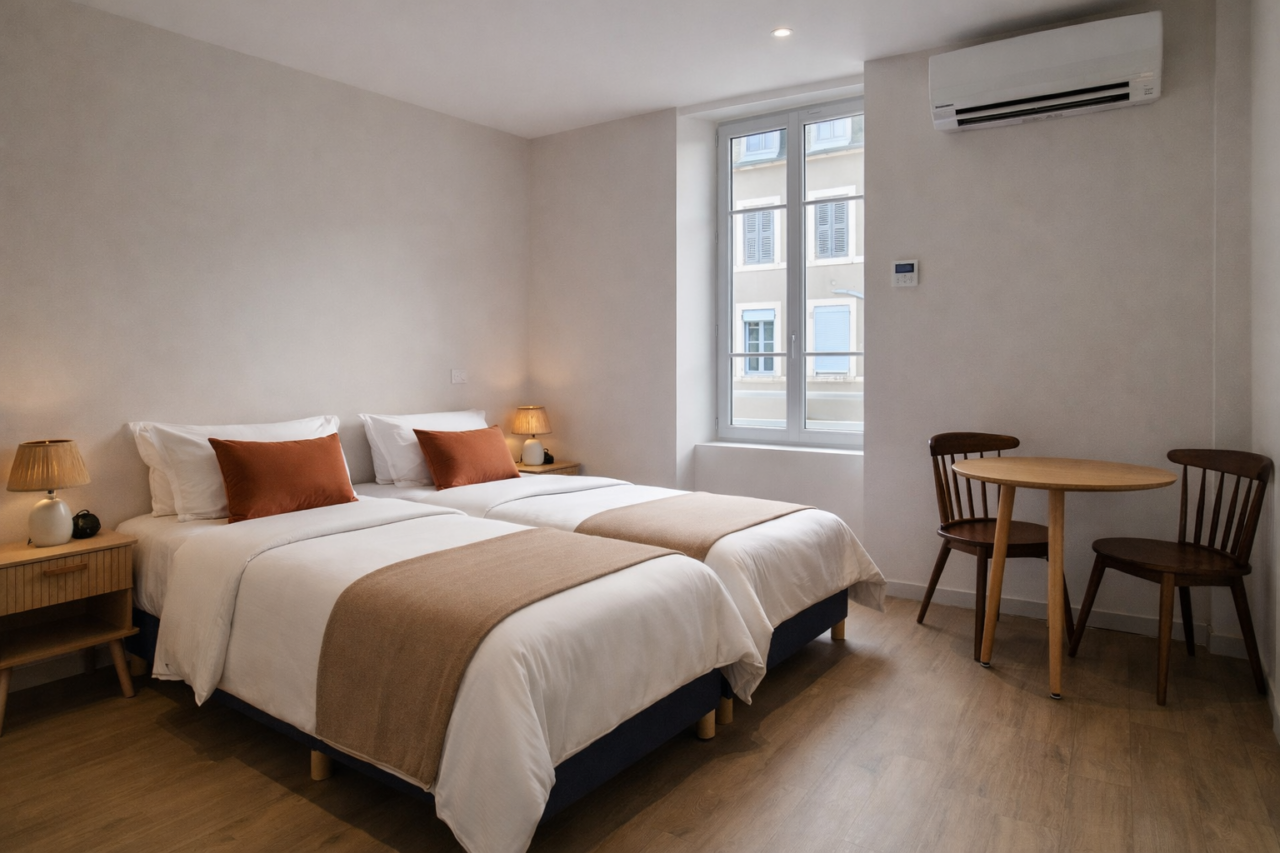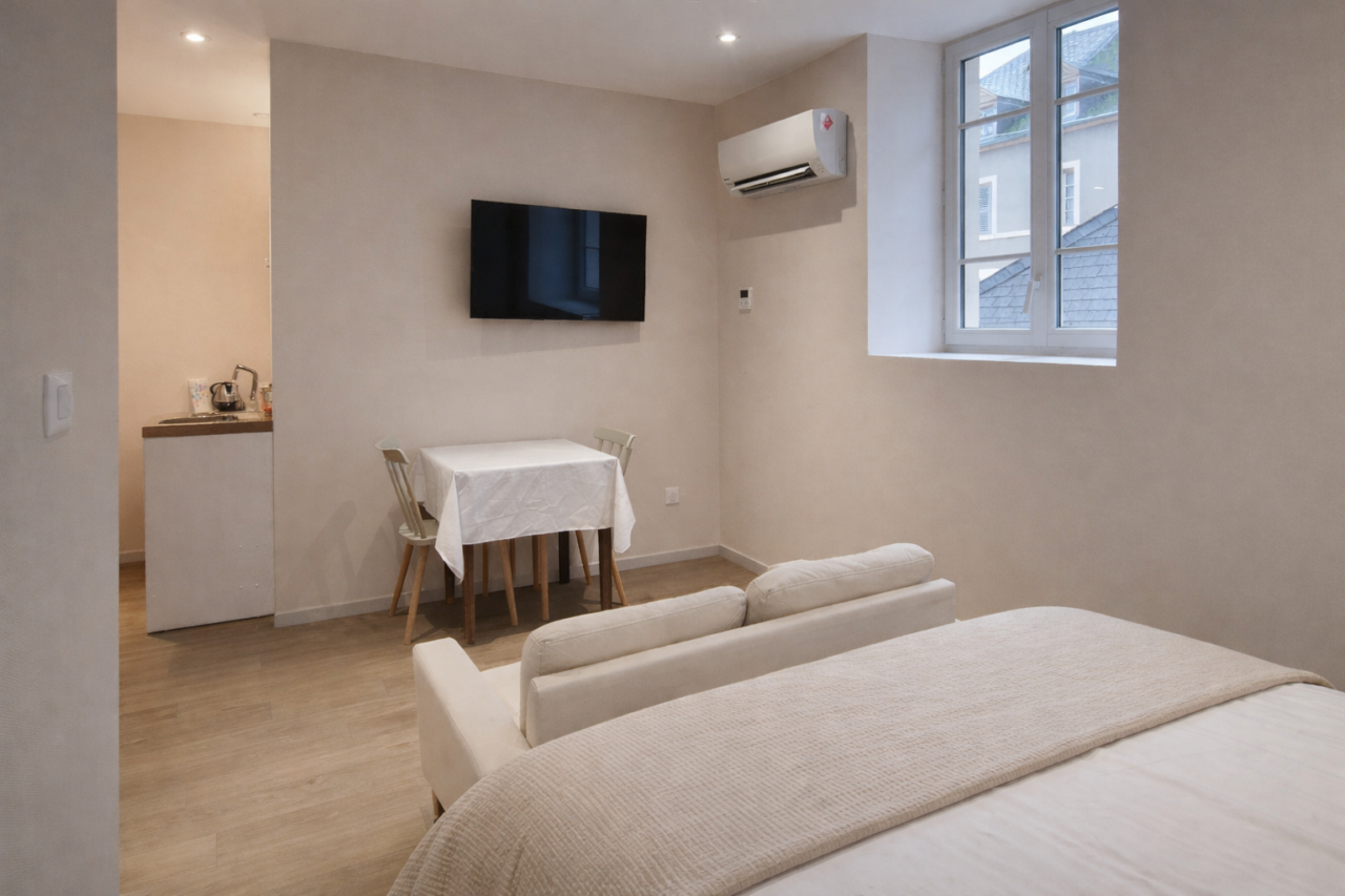 À seulement 50 mètres des Thermes de Bourbon-Lancy, l’Hôtel des Thermes bénéficie d’une situation exceptionnelle, idéale pour les curistes comme pour les voyageurs en quête de confort et de tranquillité. Cette charmante demeure propose 6 studios entièrement rénovés, récemment remis à neuf et pensés pour offrir un haut niveau de confort et une grande fonctionnalité. Climatisés, soigneusement aménagés et décorés avec sobriété, ils disposent d’équipements modernes pour un séjour agréable, quelle que soit sa durée. Les studios N°1, N°2, N°6 sont réservables du dimanche au dimanche. (Idéal pour les cures Fibromyalgie ) Les studios N°3, N°4, N°5 sont réservables du Mercredi au Mercredi La proximité immédiate des Thermes permet un quotidien sans contrainte : tout est accessible à pied. Le cadre est calme, propice au repos, tout en restant proche du centre-ville, des parcs thermaux et des principaux sites de Bourbon-Lancy. L’établissement se compose de 2 studios en rez-de-chaussée, 3 studios à l’étage et 1 studio dans une maison indépendante accessible en rez-de-chaussée également, offrant différentes configurations selon les besoins. Stationnement facile dans la rue à proximité immédiate. Ouvert toute l’année, l’Hôtel des Thermes accueille curistes, professionnels et vacanciers. Classement *** en cours (BBC 3).