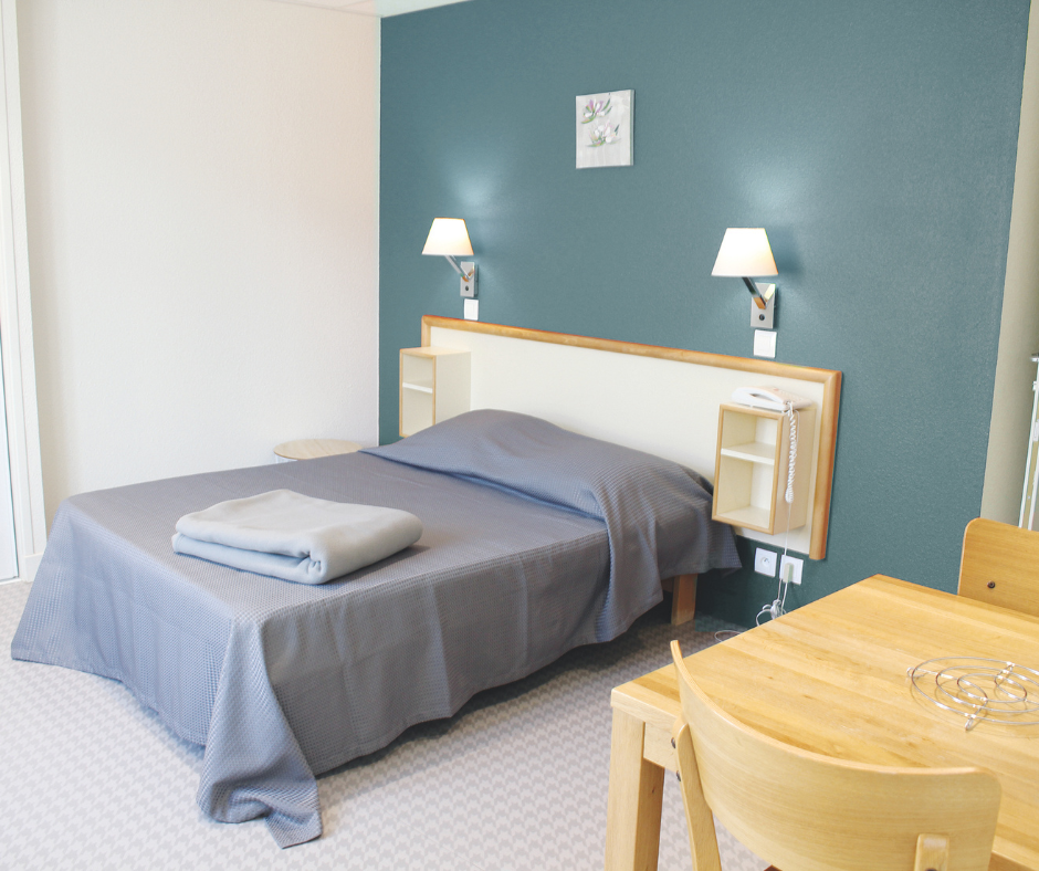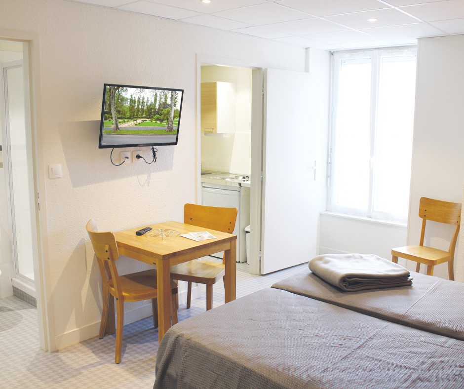 Meublés en Résidence Thermale À Bourbon-Lancy, à seulement 100 mètres des Thermes de Bourbon-Lancy, la Résidence Castelet vous accueille dans un environnement calme, moderne et verdoyant. La résidence propose 14 studios meublés, parfaitement équipés pour 1 à 3 personnes (studio 108) , idéals pour les séjours thermaux, touristiques ou de moyenne durée. Avec ses coursives extérieures ouvertes sur le Parc Puzenat, la Résidence Castelet offre une atmosphère apaisante, où confort et nature se rencontrent. • Des studios fonctionnels et bien équipés Studios meublés tout équipés avec kitchenette Salle de bain avec douche Mobilier de qualité Volets roulants WIFI gratuit Accessibilité possible par ascenseur (via la Résidence Saint-Léger) Certains studios avec petit balcon sur coursive • Capacité & Hébergement Studios pour 1 à 3 personnes 1 appartement avec 2 lits de 90 cm + 1 lit de 90 cm en mezzanine, idéal pour un séjour partagé • Services & équipements Parking couvert et non couvert sécurisé par barrière et digicode (sur réservation – voir tarifs) Grande buanderie collective avec lave-linge et sèche-linge Espace extérieur commun avec salon de jardin Calme de la cour intérieure Vue privilégiée sur les daims du Parc Puzenat (selon orientation des studios)